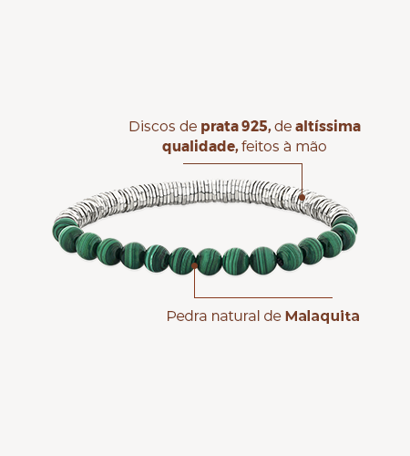 Pulseira masculina Amazônia, confeccionada com Malaquita natural, pedra preciosa símbolo de transformação e renovação. Unida a discos de prata 925 em composição marcante e elegante.