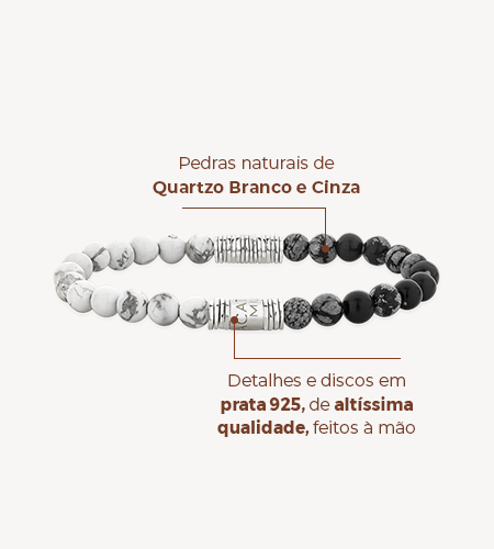 Pulseira masculina Búzios, confeccionada com pedras naturais de Quartzo Branco e Cinza, símbolo clareza nas escolhas. Com tons neutros e elegantes, essa pulseira te acompanha com segurança e estilo.