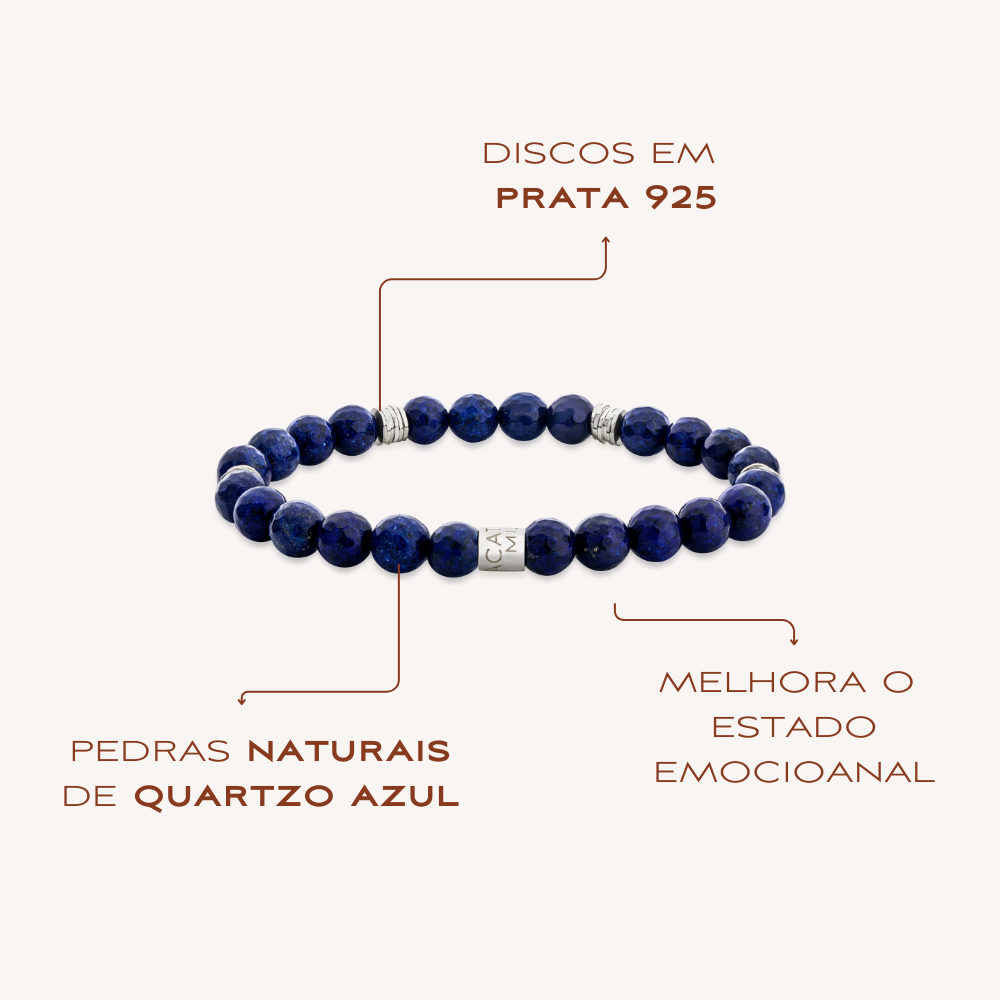 Pulseira masculina Capitolio, confeccionada com pedras naturais de Quartzo Azul, pedra que simboliza equilíbrio e serenidade. Discos de prata 925 complementam o design, trazendo mais sofisticação.