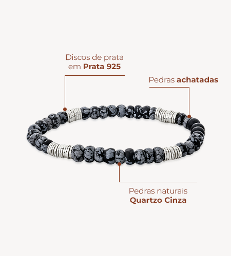 Pulseira masculina Palmarola, confeccionada com Quartzo Cinza — símbolo de discernimento e estabilidade — e discos de prata 925 com acabamento refinado.