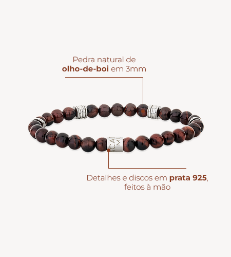Pulseira masculina Verona, confeccionada com pedras naturais de Olho-de-Boi, símbolo de coragem e energia. Discos de prata 925 complementam a composição.