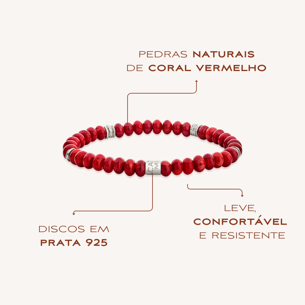 A pulseira em Coral Vermelho traz energia vibrante e proteção, combinando a força da pedra natural com a sofisticação dos Discos de Prata 925.