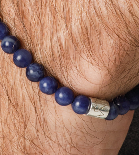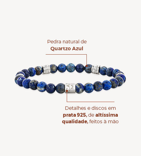 Pulseira masculina Puglia, confeccionada com pedras naturais de Quartzo Azul, pedra que simboliza equilíbrio e serenidade. Discos de prata 925 complementam o design, trazendo mais sofisticação.