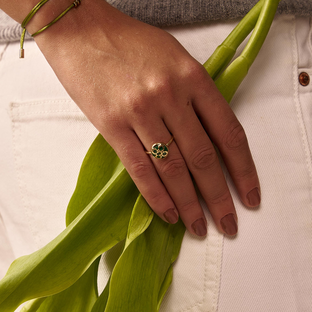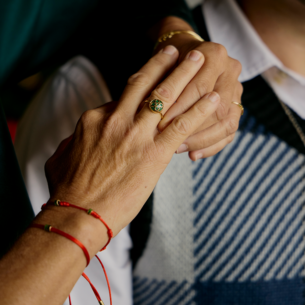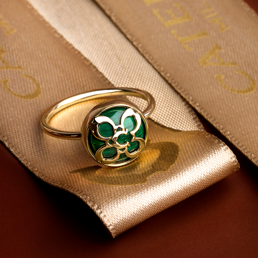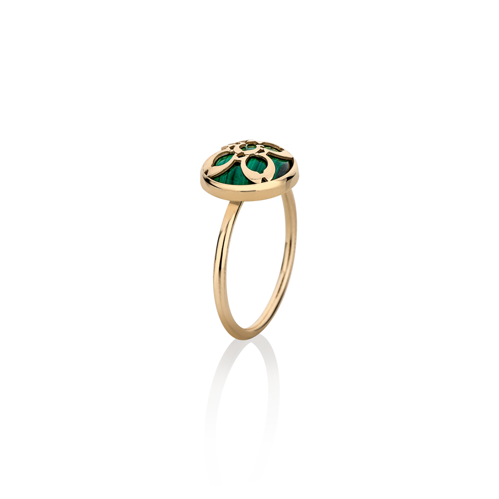 A profundidade da malaquita encontra o ouro em traços precisos, criando uma joia que atravessa gerações — um manifesto sutil de sofisticação.