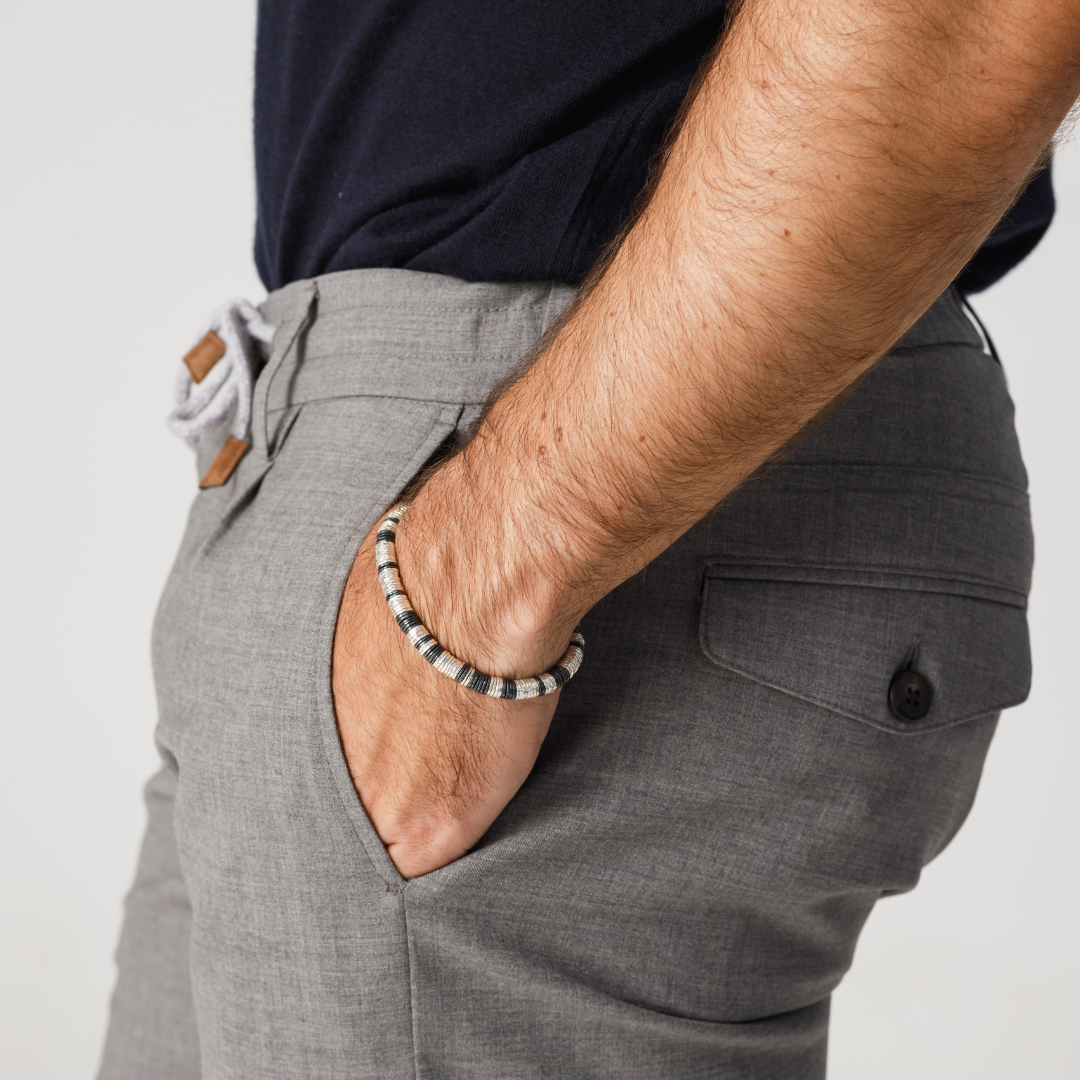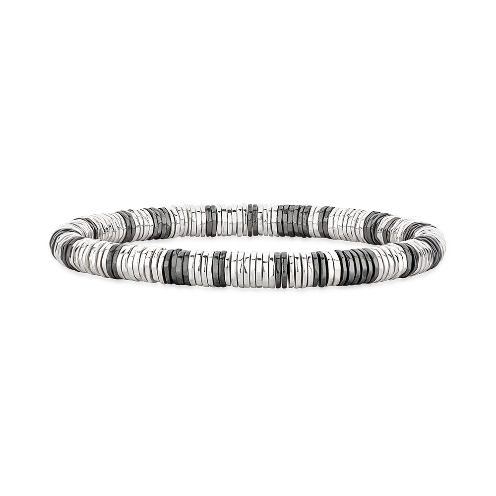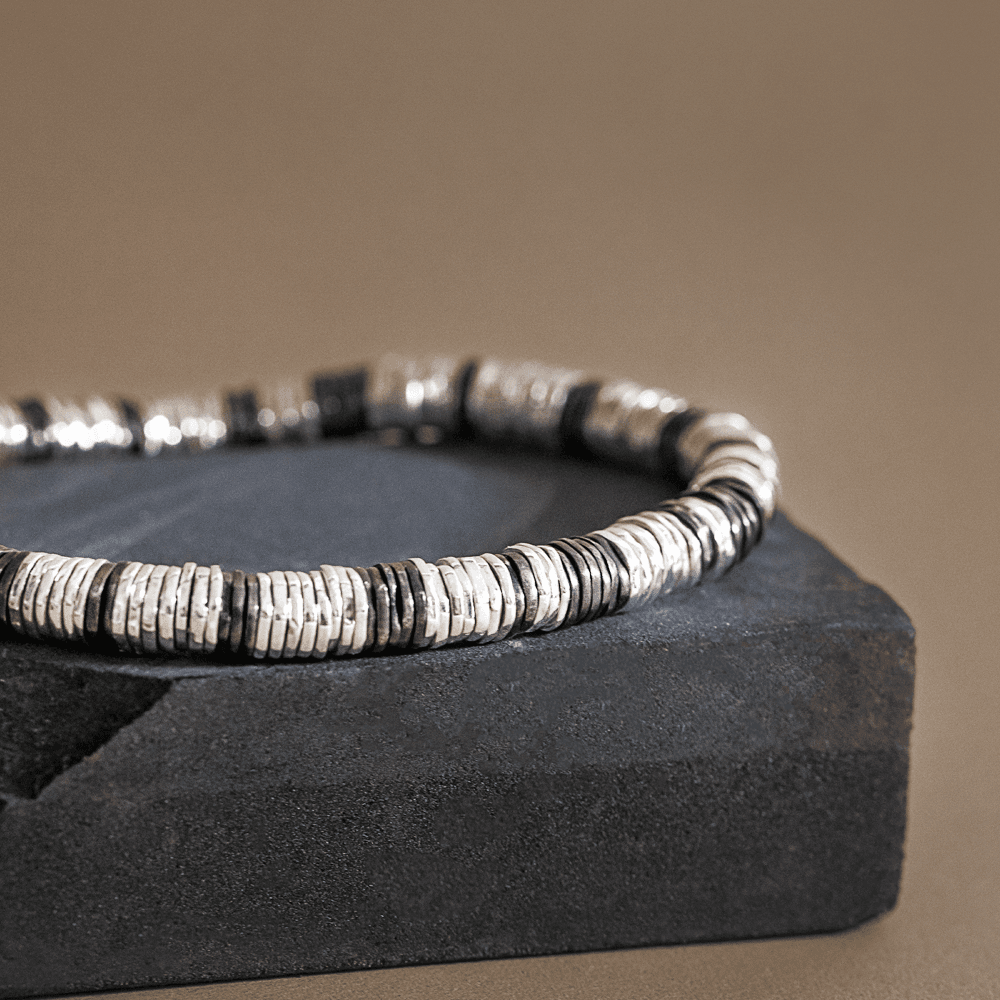 Pulseira masculina Merano, confeccionada inteiramente com mais de 200 discos de prata 925, cada um feito à mão e com um design único. Uma joia única que reflete sofisticação e um trabalho artesanal impecável.