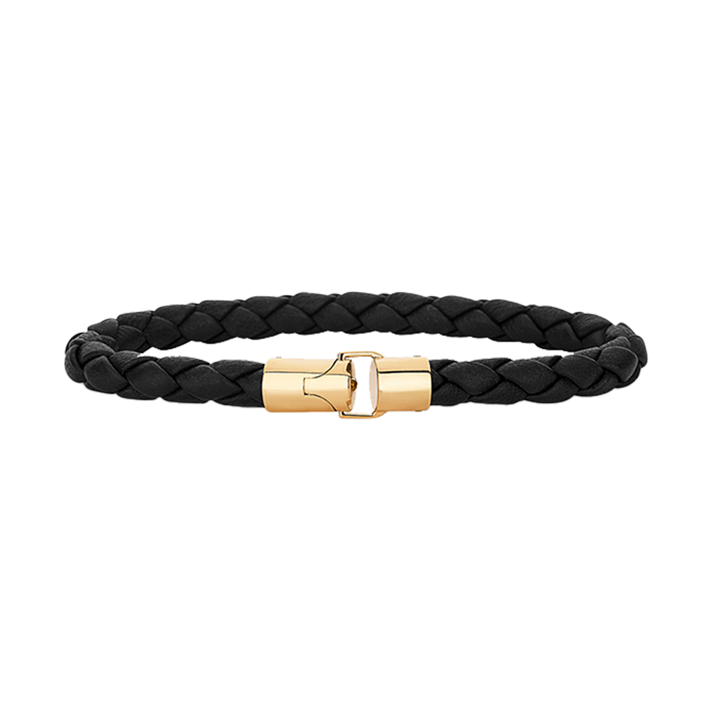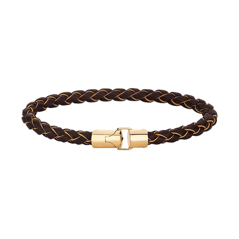 Pulseira 18:30 em couro traçado com fecho patenteado em ouro 18k. Uma joia de presença marcante, com couro firme e textura trabalhada que entrega mais impacto visual.
