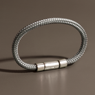 A tonalidade cinza reflete neutralidade e sofisticação, tornando esta pulseira masculina de prata 925 uma escolha versátil para qualquer ocasião. Seu design mais espesso valoriza o pulso masculino, trazendo equilíbrio entre estilo esportivo e elegância urbana.