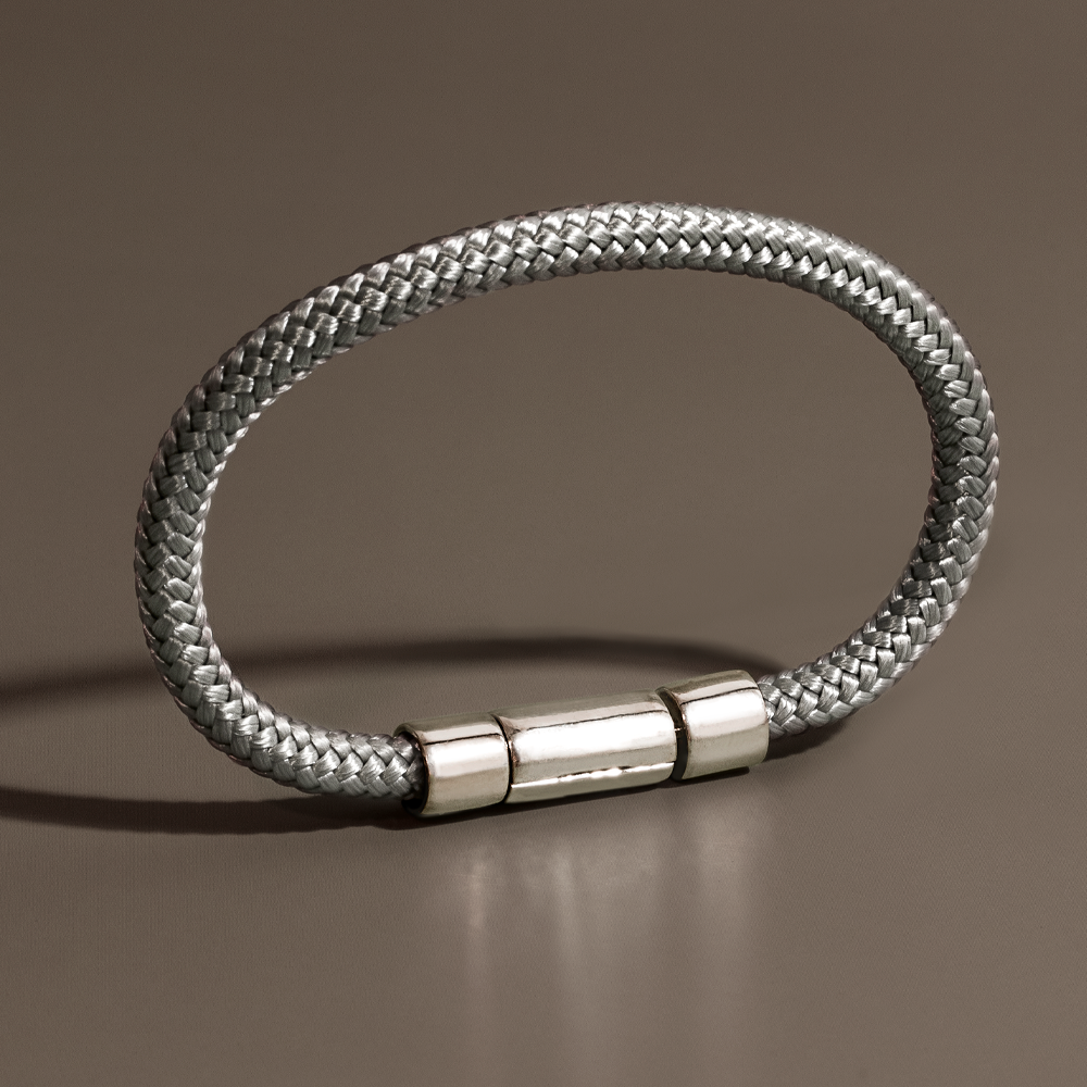 A pulseira náutica cinza destaca-se pelo design robusto e contemporâneo. Confeccionada em corda náutica de 6mm, com uma única volta e fecho em prata 925, ela traduz uma elegância sutil, pensada para quem prefere composições sólidas e marcantes.