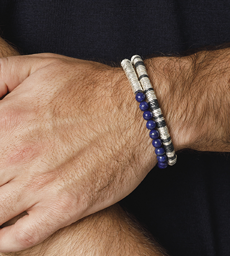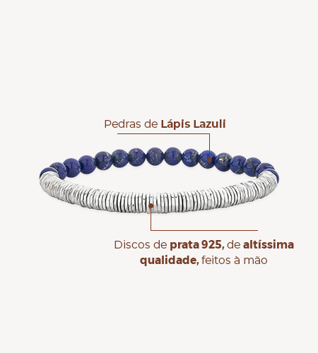 Pulseira masculina Capri, confeccionada com Lápis Lazuli — pedra preciosa que simboliza sabedoria e autoconfiança. A prata 925 aparece em discos únicos, trazendo equilíbrio à composição.