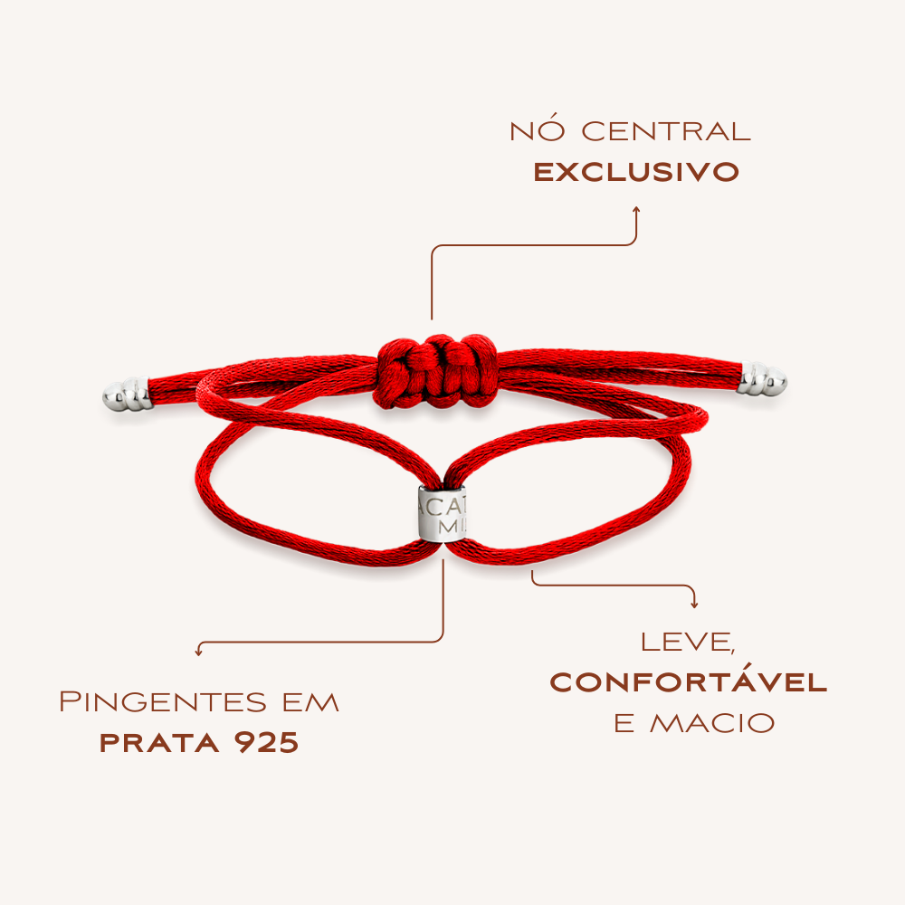 Pulseira vermelha entrelaçada em fio de seda com pingente em prata 925. O entrelaçado traz um visual firme e expressivo, enquanto a seda proporciona conforto com um toque único. A cor vermelha é símbolo de proteção, coragem e boas energias.