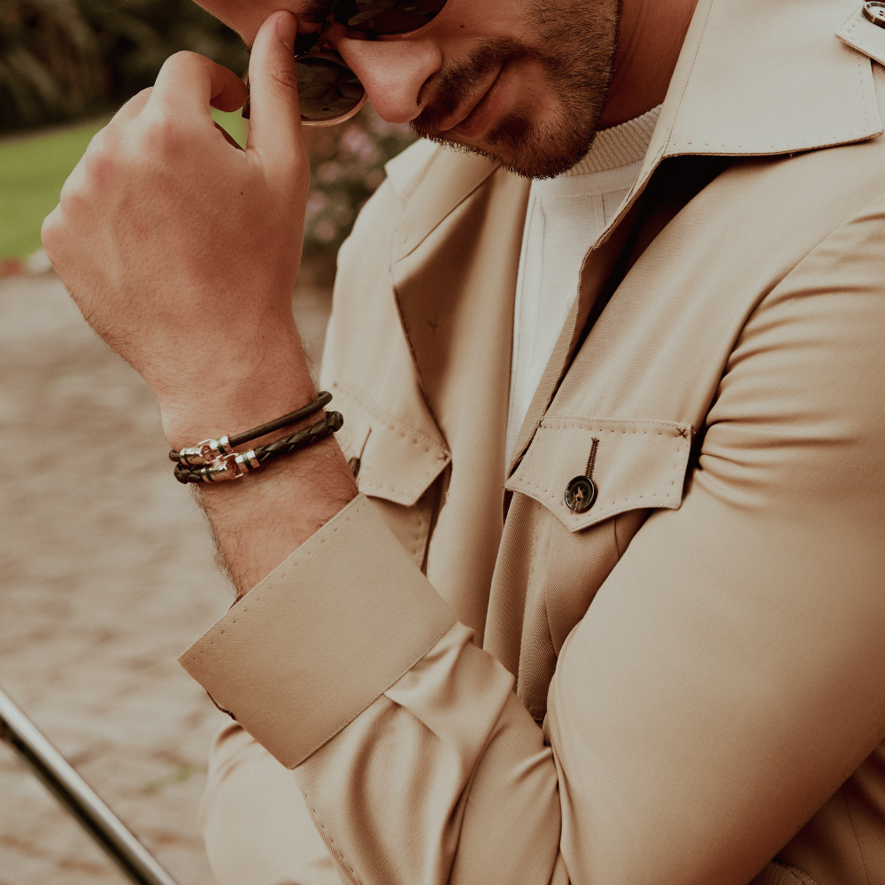 Cada peça é cuidadosamente feita à mão por artesãos qualificados, utilizando apenas materiais nobres e importados — uma combinação que garante durabilidade, sofisticação e o caráter único de cada pulseira.